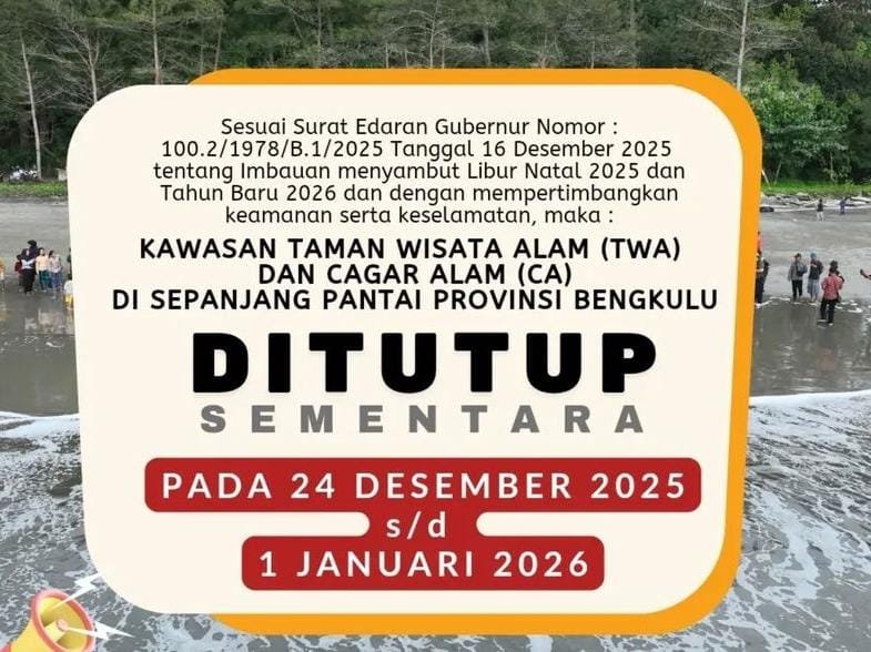 Penutupan tersebut tertuang dalam Pengumuman Nomor PG.6/K.10/TU/KSA.04.01/B/12/2025 yang ditandatangani Kepala BKSDA Bengkulu, Himawan Sasongko. Kebijakan berlaku mulai 24 Desember 2025 hingga 1 Januari 2026. Selama periode itu, seluruh aktivitas wisata di kawasan konservasi pesisir dilarang, kecuali untuk kepentingan khusus seperti penelitian dan pengembangan ilmu pengetahuan dengan izin resmi.